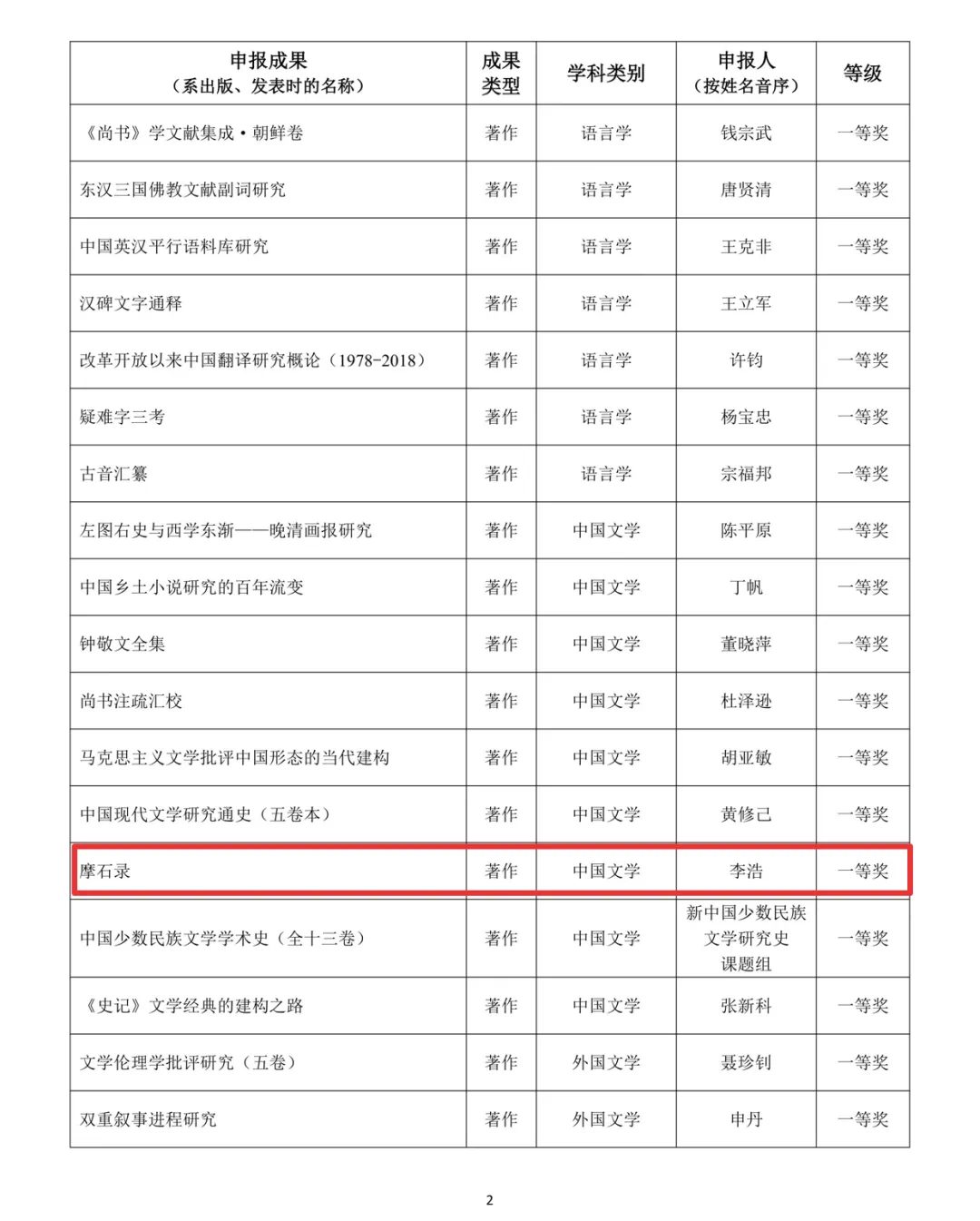 李浩教授的《摩石录》获著作论文类一等奖,吴振磊教授、白永秀教授的《破解易地扶贫搬迁四大难题的建议》获咨询服务报告类二等奖,张阿利教授、吉平教授的《求变·裂变·新变:改革开放40年与中国西部电影变迁》获著作论文类三等奖。