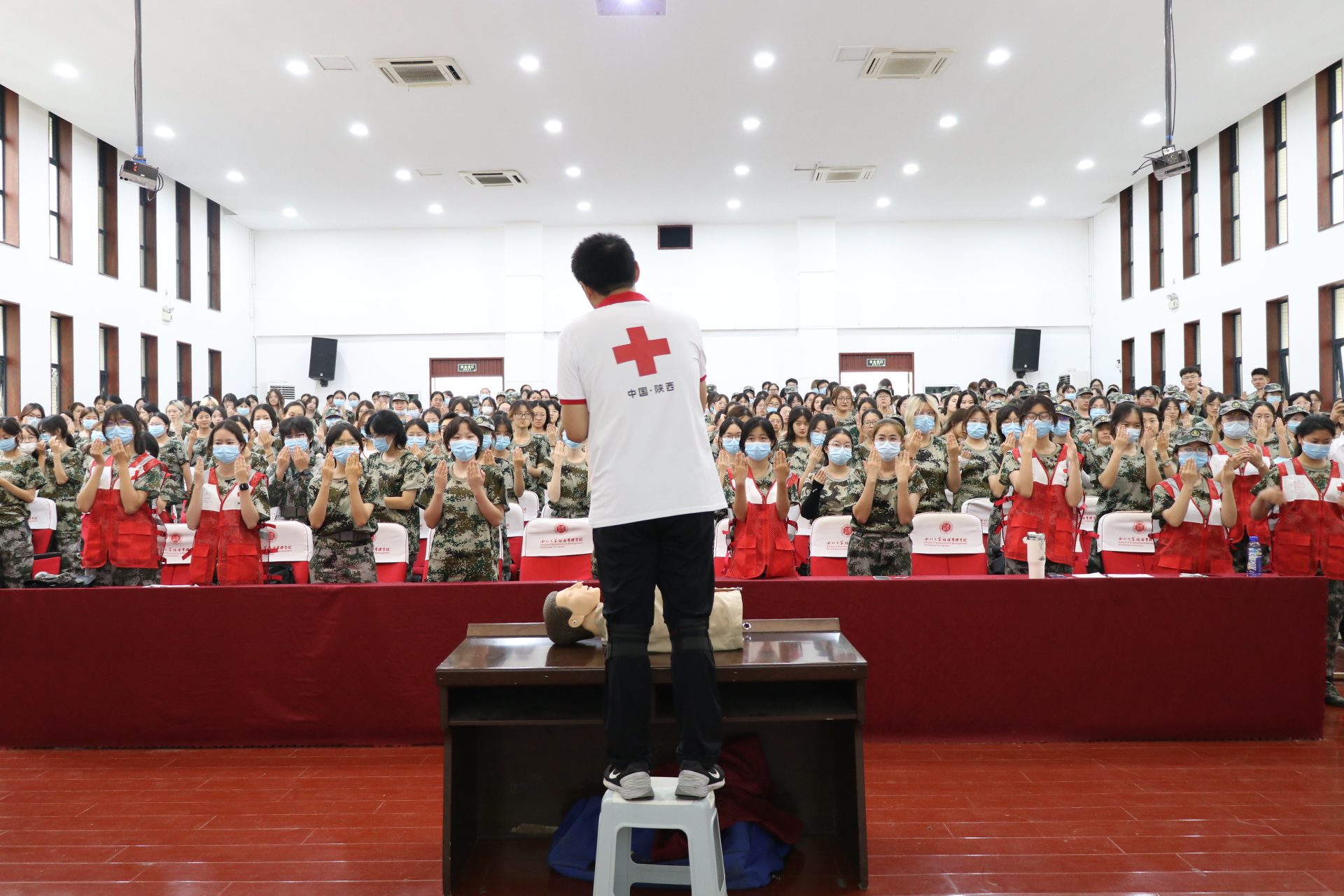 培训在陕西省红十字会应急救护专业讲师的自我介绍中拉开帷幕,他们以“呼救专用手势”引入,采用“问题式导学”的方法,通过理论讲解和实际操作相结合的形式,将晦涩难懂的急救知识与技能“掰开揉碎”,深入浅出地讲解了心肺复苏(CPR)操作流程、自动体外除颤器(AED)使用方法及注意事项。实操环节中,同学们在实训老师的指导下不断梳理急救流程、规范动作要领,在情景演绎中沉浸式体验应急救护氛围,掌握心肺复苏技能。经过培训及考核,1200名本科新生获得陕西省红十字会颁发的“红十字救护员(初级)”证书。
