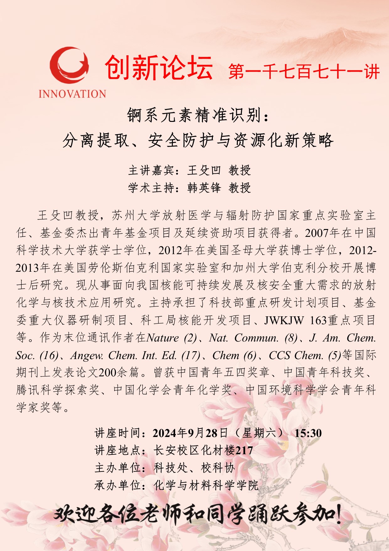 王殳凹 教授 宝威体育官网首页创新论坛第一千七百七十一讲:锕系元素精准识别:分离提取、安全防护与资源化新策略 讲座时间 2024年9月28日(星期六) 15:30 讲座地点 长安校区化材楼217 讲座人介绍 王殳凹 教授 讲座内容
