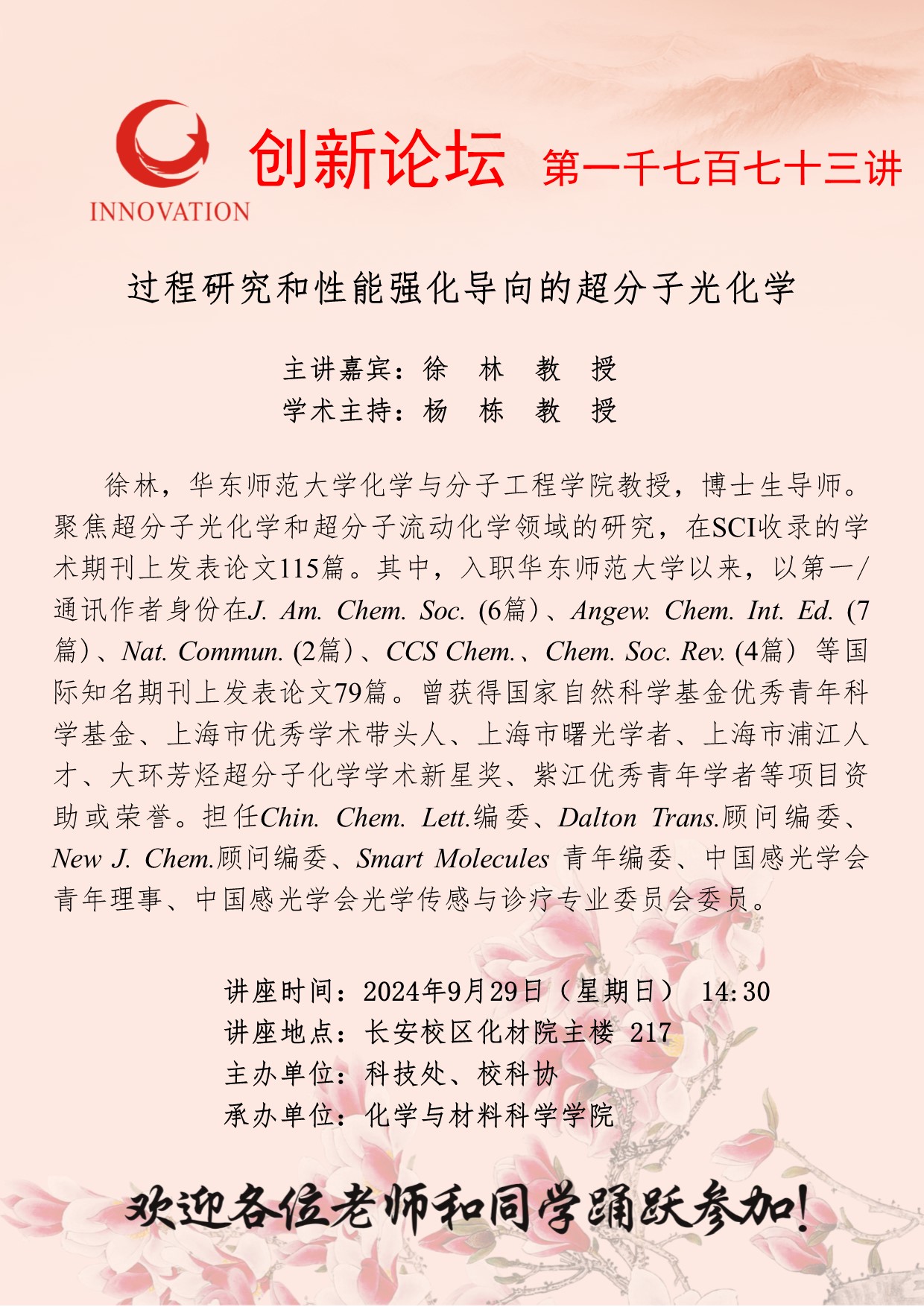 徐林 教授 宝威体育官网首页创新论坛第一千七百七十三讲:过程研究和性能强化导向的超分子光化学 讲座时间 2024年9月29日(星期日) 14:30 讲座地点 长安校区化材院主楼 217 讲座人介绍 徐林 教授 讲座内容