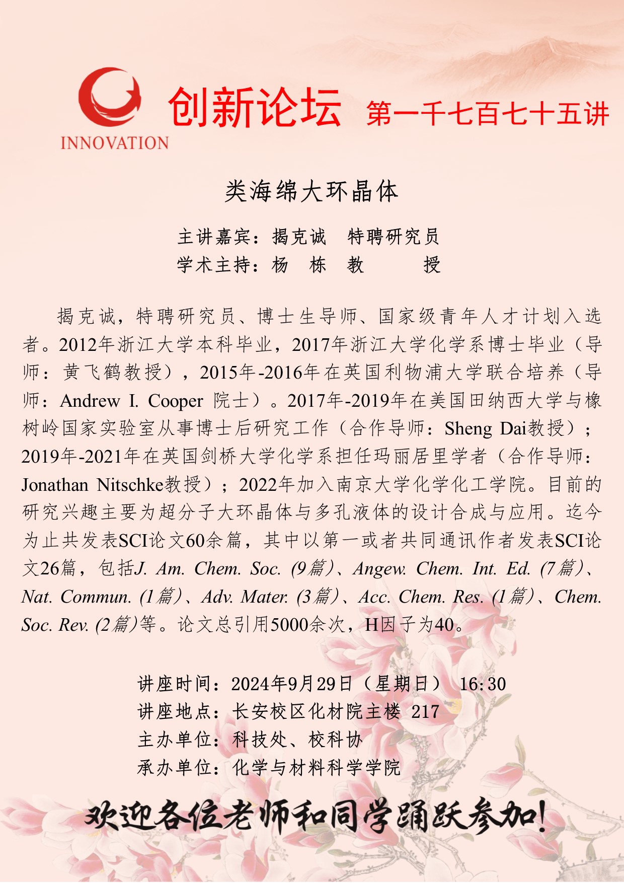 揭克诚 特聘研究员 宝威体育官网首页创新论坛第一千七百七十五讲:类海绵大环晶体 讲座时间 2024年9月29日(星期日) 16:30 讲座地点 长安校区化材院主楼 217 讲座人介绍 揭克诚 特聘研究员 讲座内容