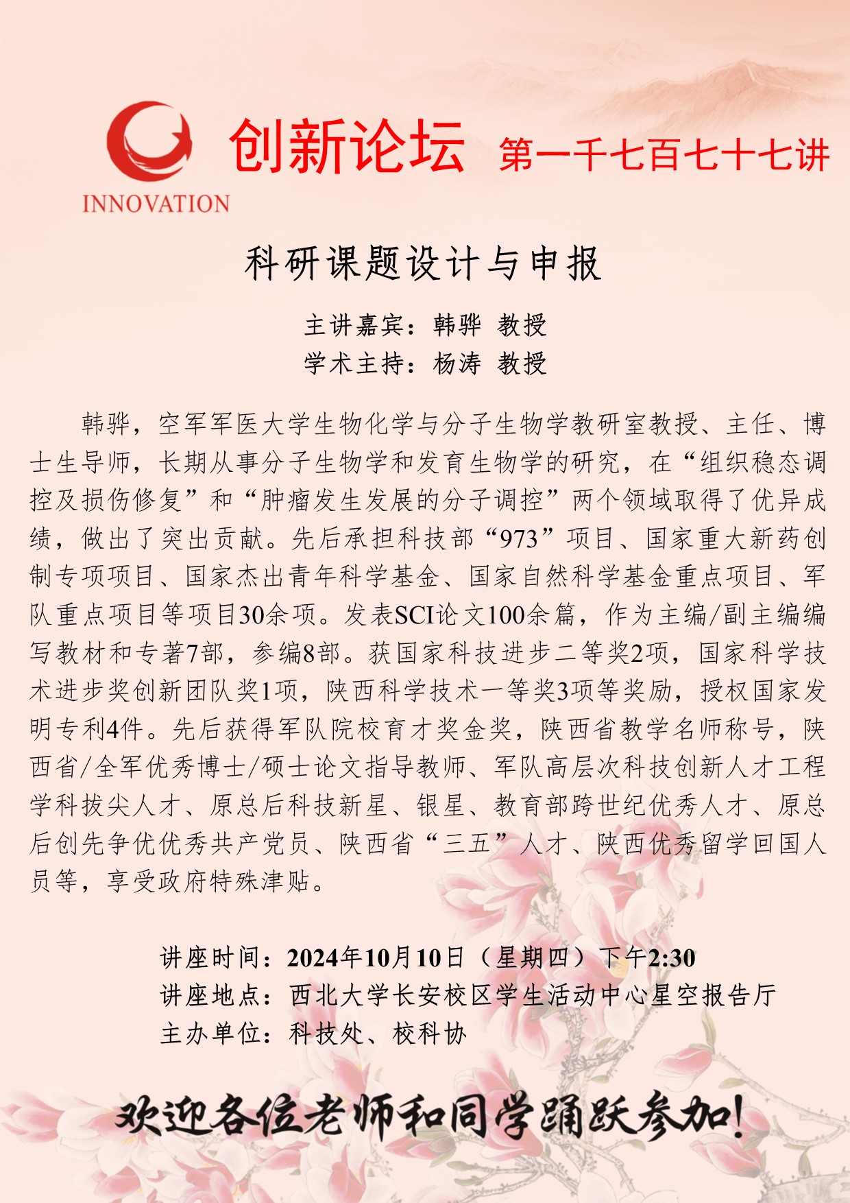 韩骅 教授 宝威体育官网首页创新论坛第一千七百七十七讲:科研课题设计与申报 讲座时间 2024年10月10日(星期四)下午2:30 讲座地点 宝威体育官网首页长安校区学生活动中心星空报告厅 讲座人介绍 韩骅 教授 讲座内容