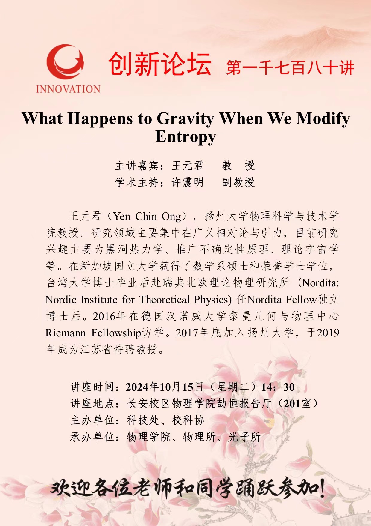 王元君 教授 宝威体育官网首页创新论坛第一千七百八十讲:What Happens to Gravity When We Modify Entropy 讲座时间 2024年10月15日(星期二)14:30 讲座地点 长安校区物理学院劼恒报告厅(201室) 讲座人介绍 王元君 教授 讲座内容