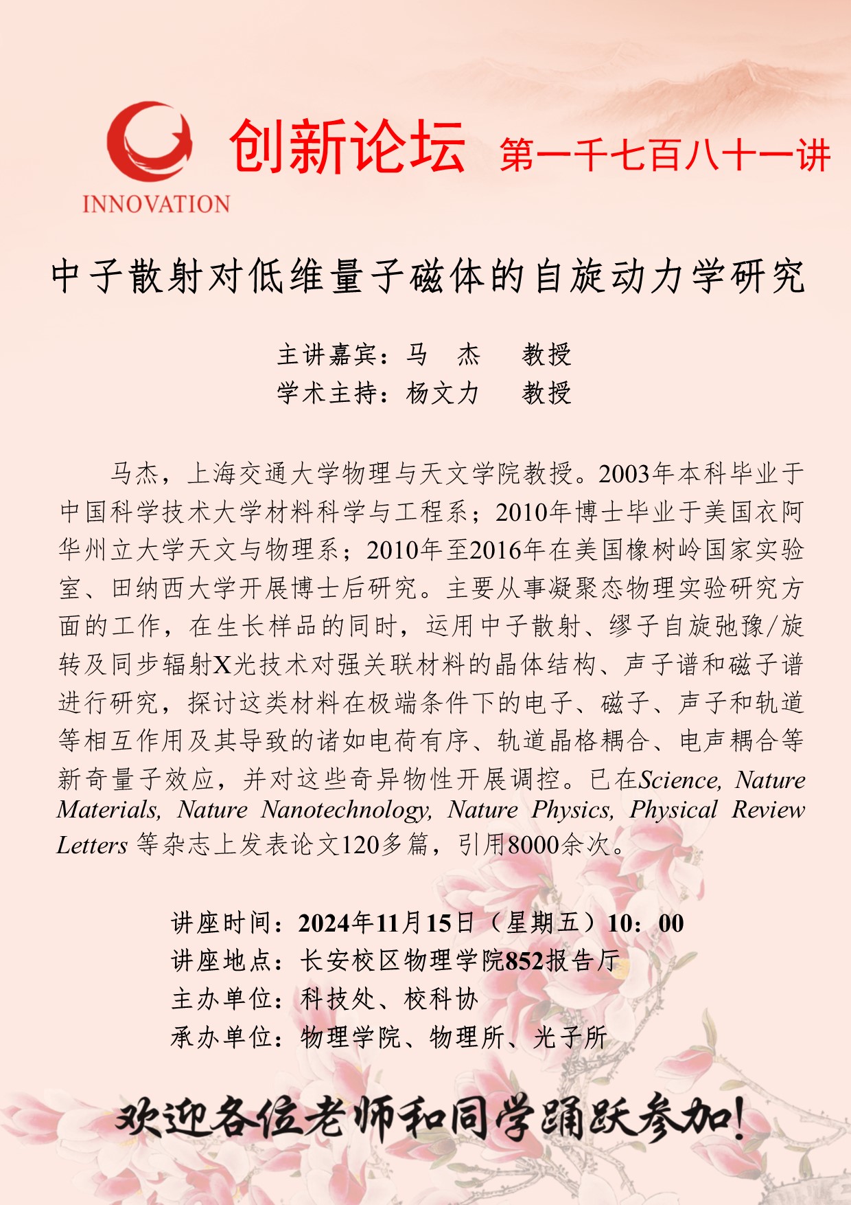 马杰 教授 宝威体育官网首页创新论坛第一千七百八十一讲:中子散射对低维量子磁体的自旋动力学研究 讲座时间 2024年11月15日(星期五)10:00 讲座地点 长安校区物理学院852报告厅 讲座人介绍 马杰 教授 讲座内容