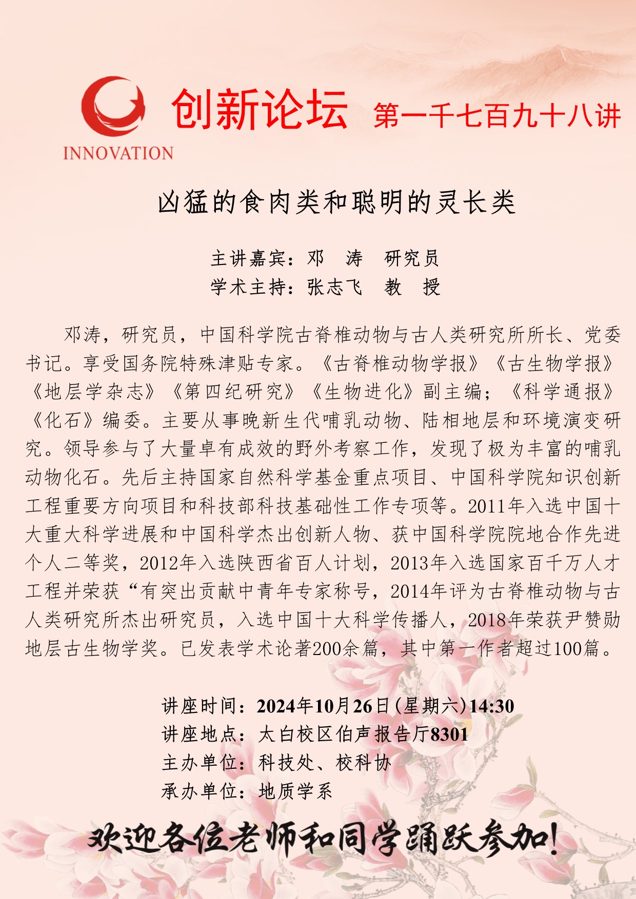 邓涛 研究员 宝威体育官网首页创新论坛第一千七百九十八讲:凶猛的食肉类和聪明的灵长类 讲座时间 2024年10月26日(星期六)14:30 讲座地点 太白校区伯声报告厅8301 讲座人介绍 邓涛 研究员 讲座内容