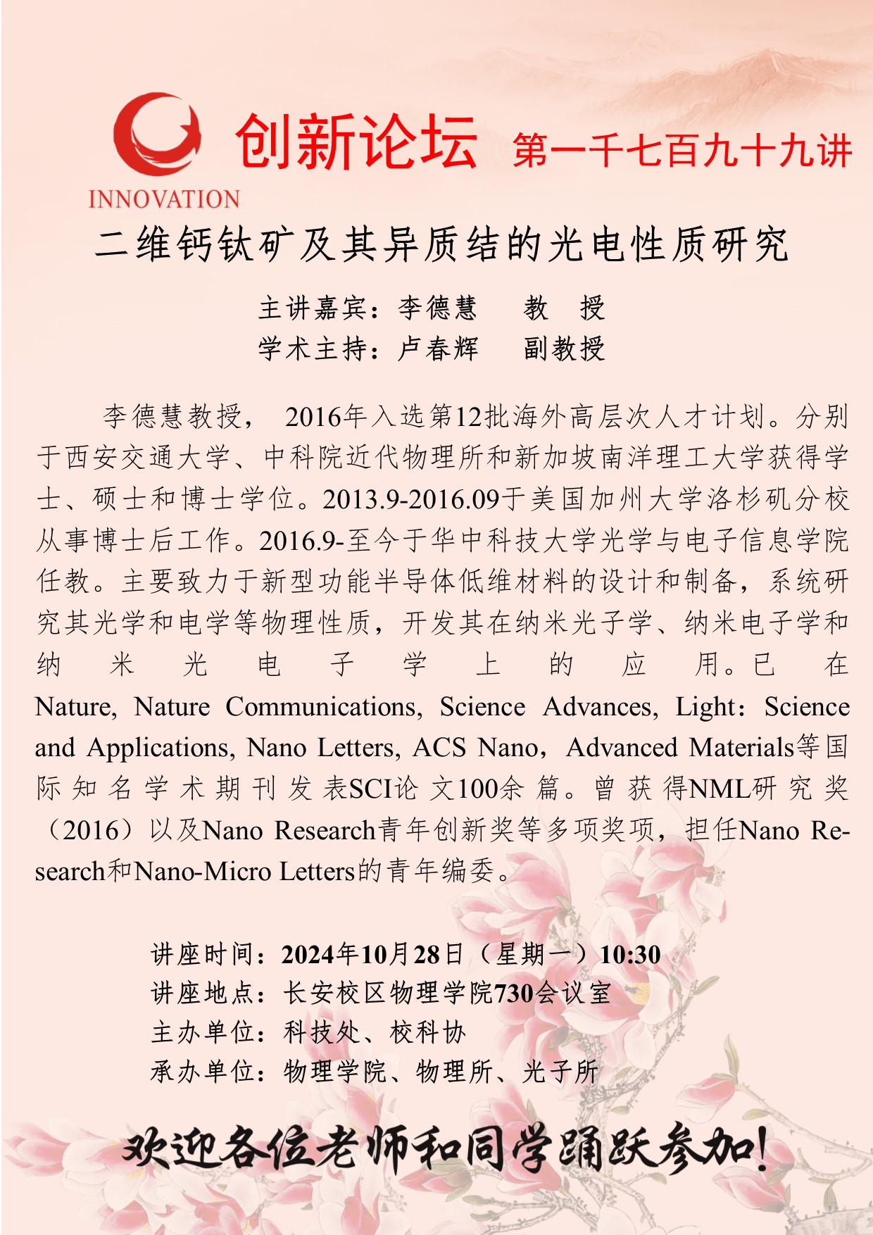 李德慧 教授 宝威体育官网首页创新论坛第一千七百九十九讲:二维钙钛矿及其异质结的光电性质研究 讲座时间 2024年10月28日(星期一)10:30 讲座地点 长安区物理学院730会议室 讲座人介绍 李德慧 教授 讲座内容