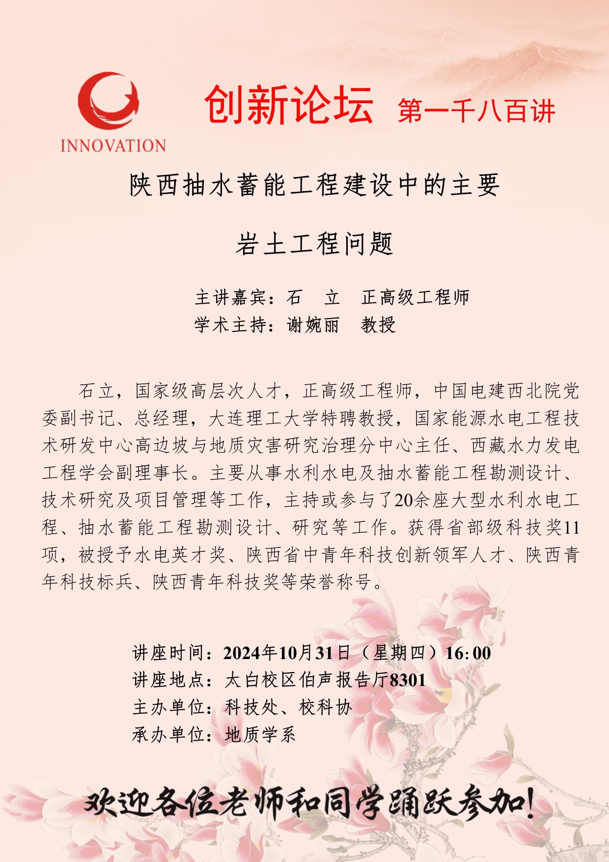 石 立 正高级工程师 宝威体育官网首页创新论坛第一千八百讲:陕西抽水蓄能工程建设中的主要岩土工程问题 讲座时间 2024年10月31日(星期四)16:00 讲座地点 太白校区伯声报告厅8301 讲座人介绍 石 立 正高级工程师 讲座内容