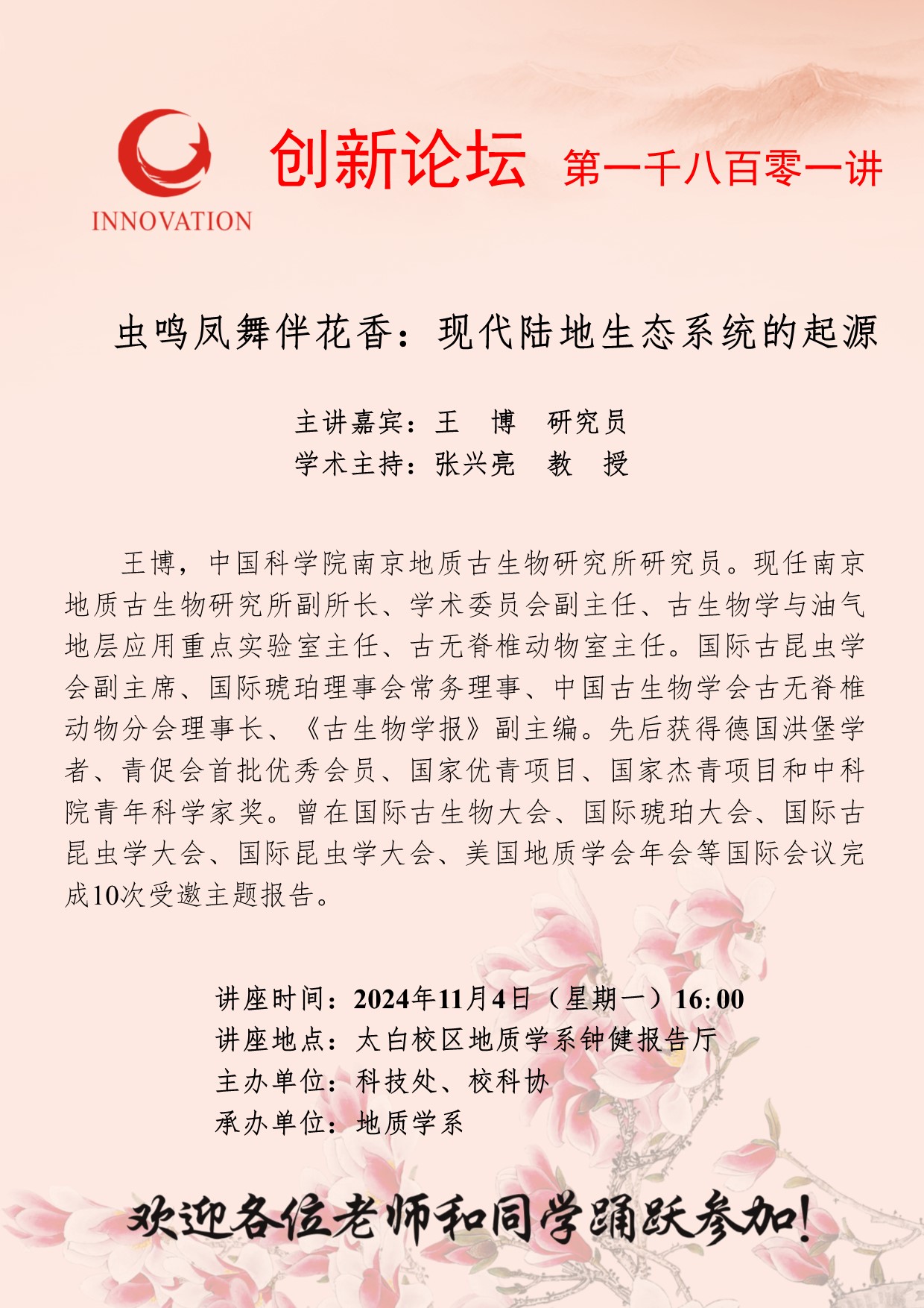 王 博 研究员 宝威体育官网首页创新论坛第一千八百零一讲:虫鸣凤舞伴花香:现代陆地生态系统的起源 讲座时间 2024年11月4日(星期一)16:00 讲座地点 太白校区地质学系钟健报告厅 讲座人介绍 王 博 研究员 讲座内容