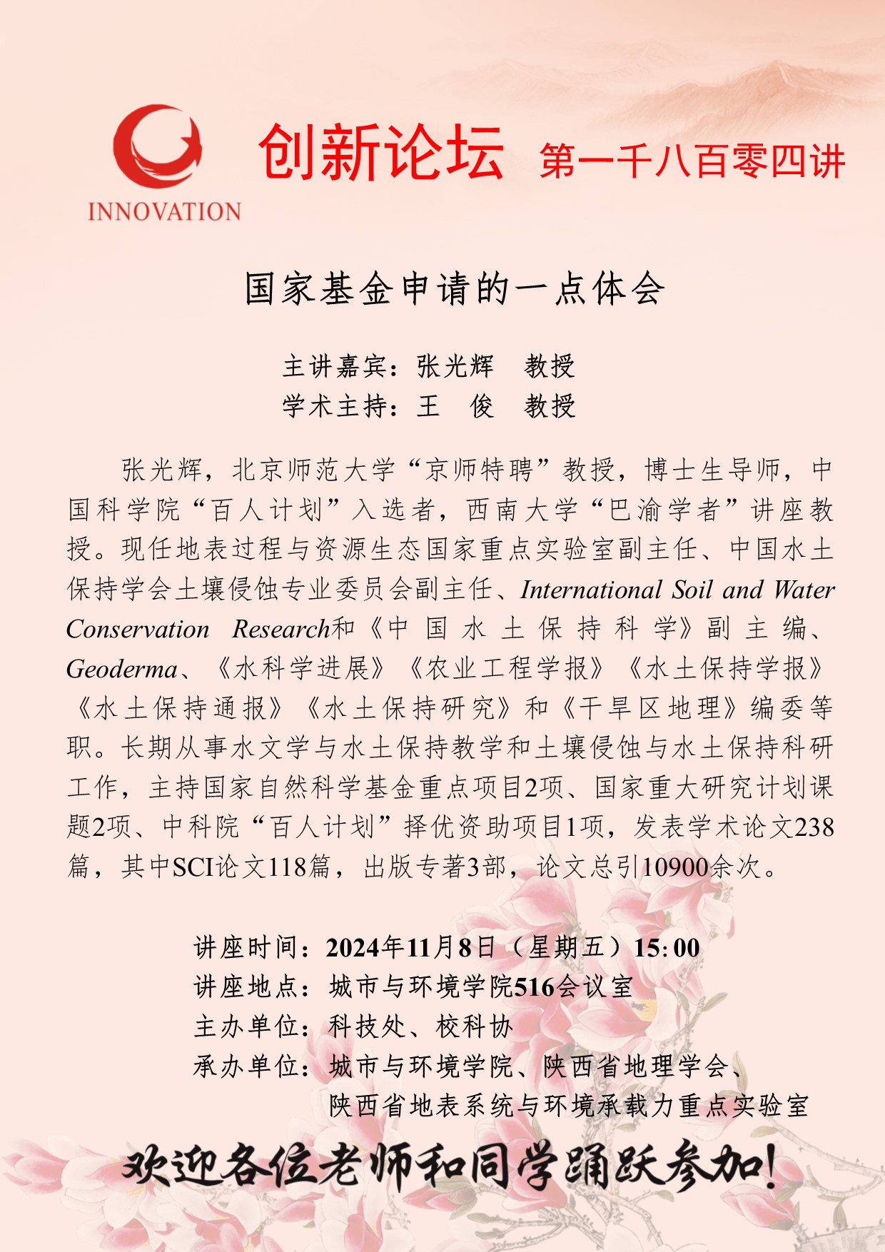 张光辉 教授 宝威体育官网首页创新论坛第一千八百零四讲:国家基金申请的一点体会 讲座时间 2024年11月8日(星期五)15:00 讲座地点 城市与环境学院516会议室 讲座人介绍 张光辉 教授 讲座内容