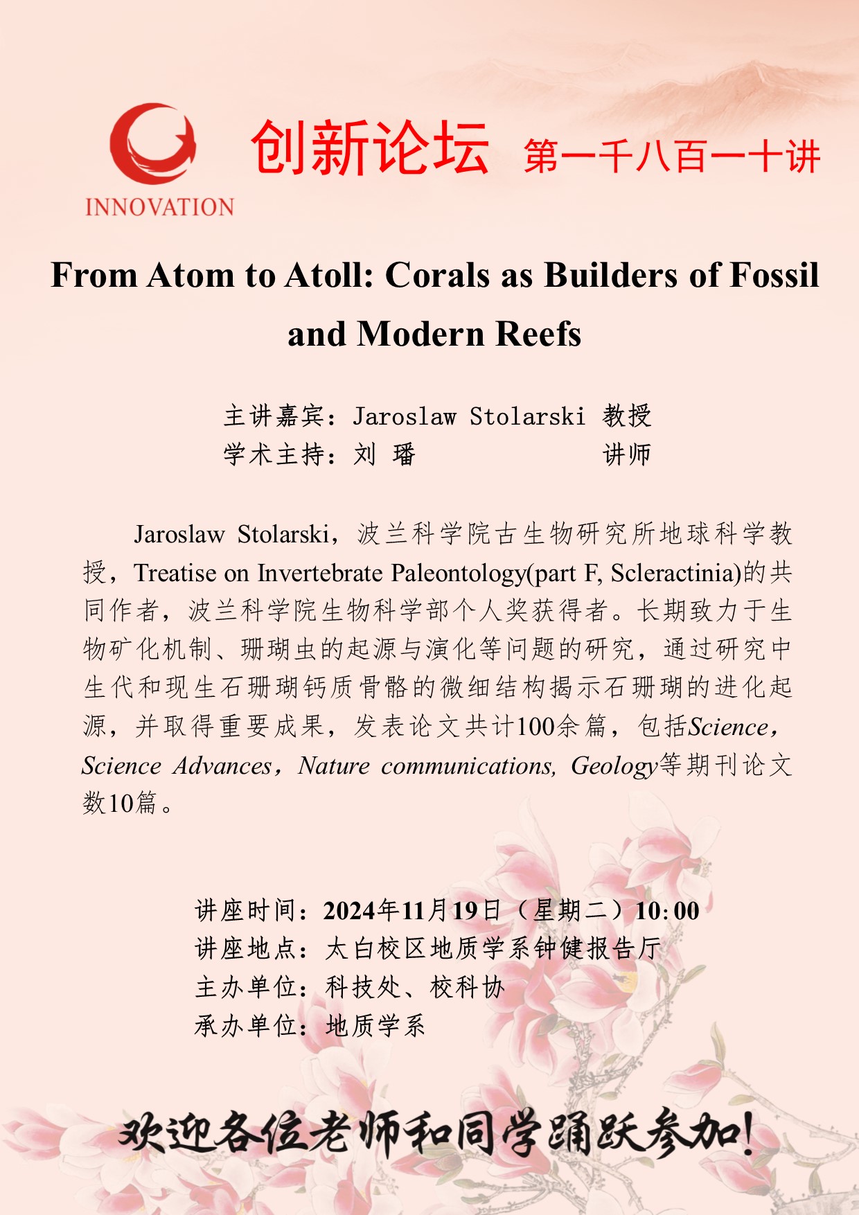 Jaroslaw Stolarski 教授 宝威体育官网首页创新论坛第一千八百一十讲:From Atom to Atoll: Corals as Builders of Fossil and Modern Reefs 讲座时间 2024年11月19日(星期二)10:00 讲座地点 太白校区地质学系钟健报告厅 讲座人介绍 Jaroslaw Stolarski 教授 讲座内容