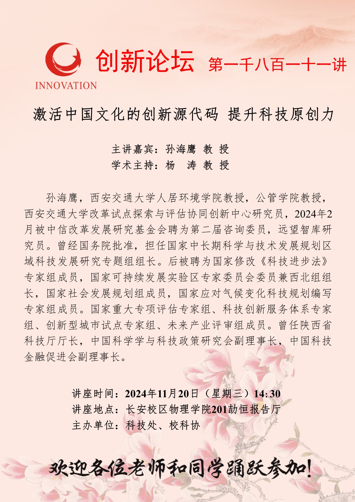 孙海鹰 教授 宝威体育官网首页创新论坛第一千八百一十一讲:激活中国文化的创新源代码 提升科技原创力 讲座时间 2024年11月20日(星期三)14:30 讲座地点 长安校区物理学院201劼恒报告厅 讲座人介绍 孙海鹰 教授 讲座内容