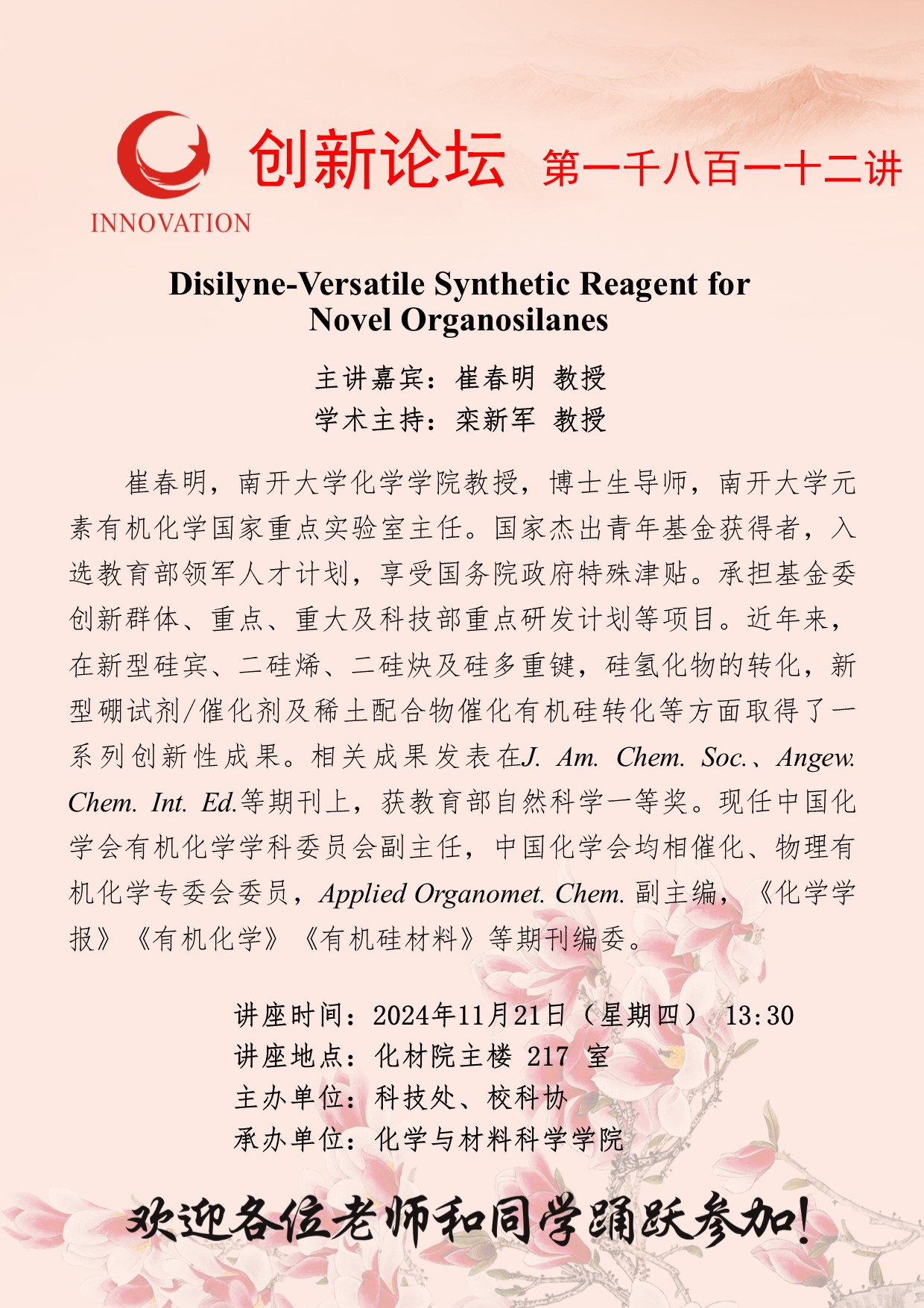 崔春明 教授 宝威体育官网首页创新论坛第一千八百一十二讲:Disilyne-Versatile Synthetic Reagent for 讲座时间 2024年11月21日(星期四) 13:30 讲座地点 化材院主楼 217 室 讲座人介绍 崔春明 教授 讲座内容