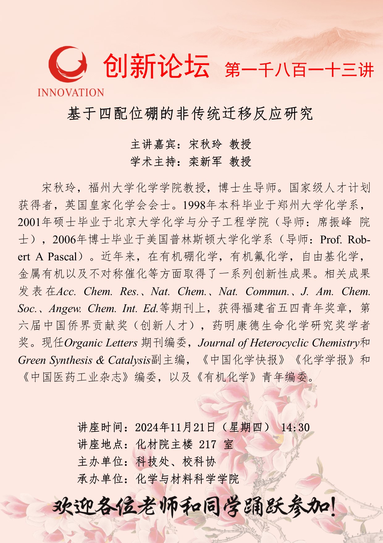 宋秋玲 教授 宝威体育官网首页创新论坛第一千八百一十三讲:基于四配位硼的非传统迁移反应研究 讲座时间 2024年11月21日(星期四) 14:30 讲座地点 化材院主楼 217 室 讲座人介绍 宋秋玲 教授 讲座内容