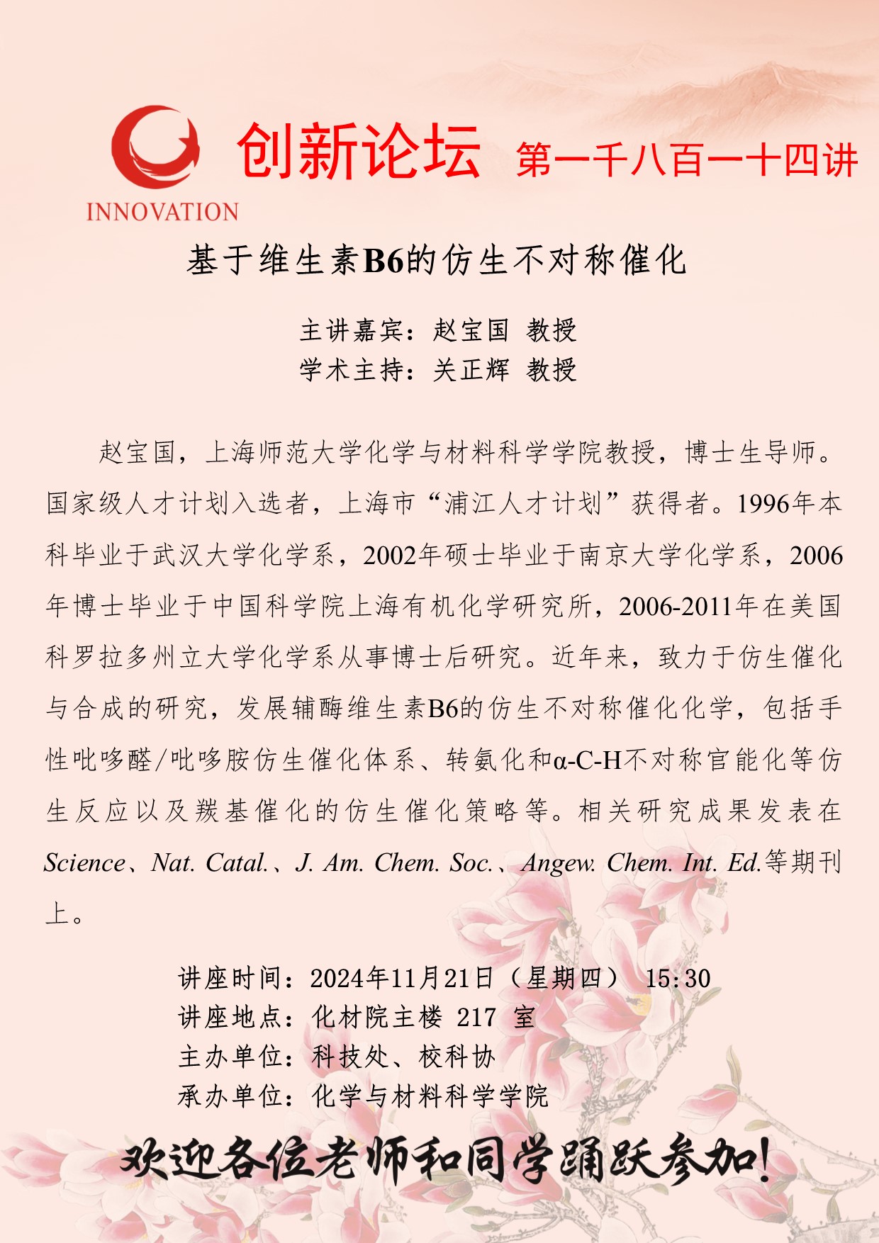 赵宝国 教授 宝威体育官网首页创新论坛第一千八百一十四讲:基于维生素B6的仿生不对称催化 讲座时间 2024年11月21日(星期四) 15:30 讲座地点 化材院主楼 217 室 讲座人介绍 赵宝国 教授 讲座内容