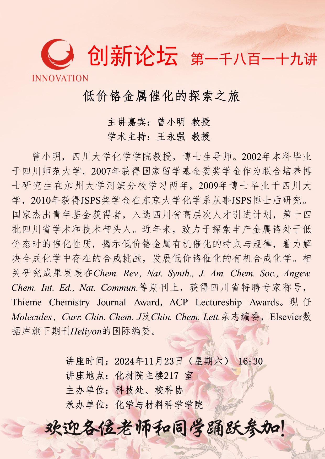 曾小明 教授 宝威体育官网首页创新论坛第一千八百一十九讲:低价铬金属催化的探索之旅 讲座时间 2024年11月23日(星期六) 16:30 讲座地点 化材院主楼217 室 讲座人介绍 曾小明 教授 讲座内容
