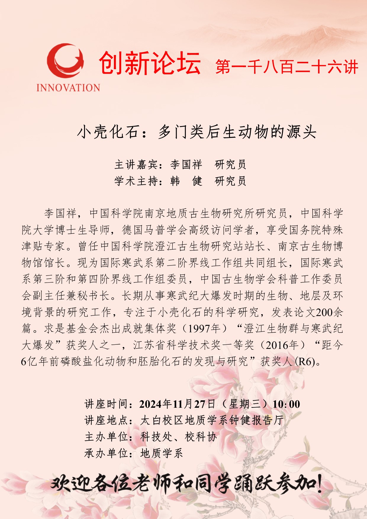 李国祥 研究员 宝威体育官网首页创新论坛第一千八百二十六讲:小壳化石:多门类后生动物的源头 讲座时间 2024年11月27日(星期三)10:00 讲座地点 太白校区地质学系钟健报告厅 讲座人介绍 李国祥 研究员 讲座内容