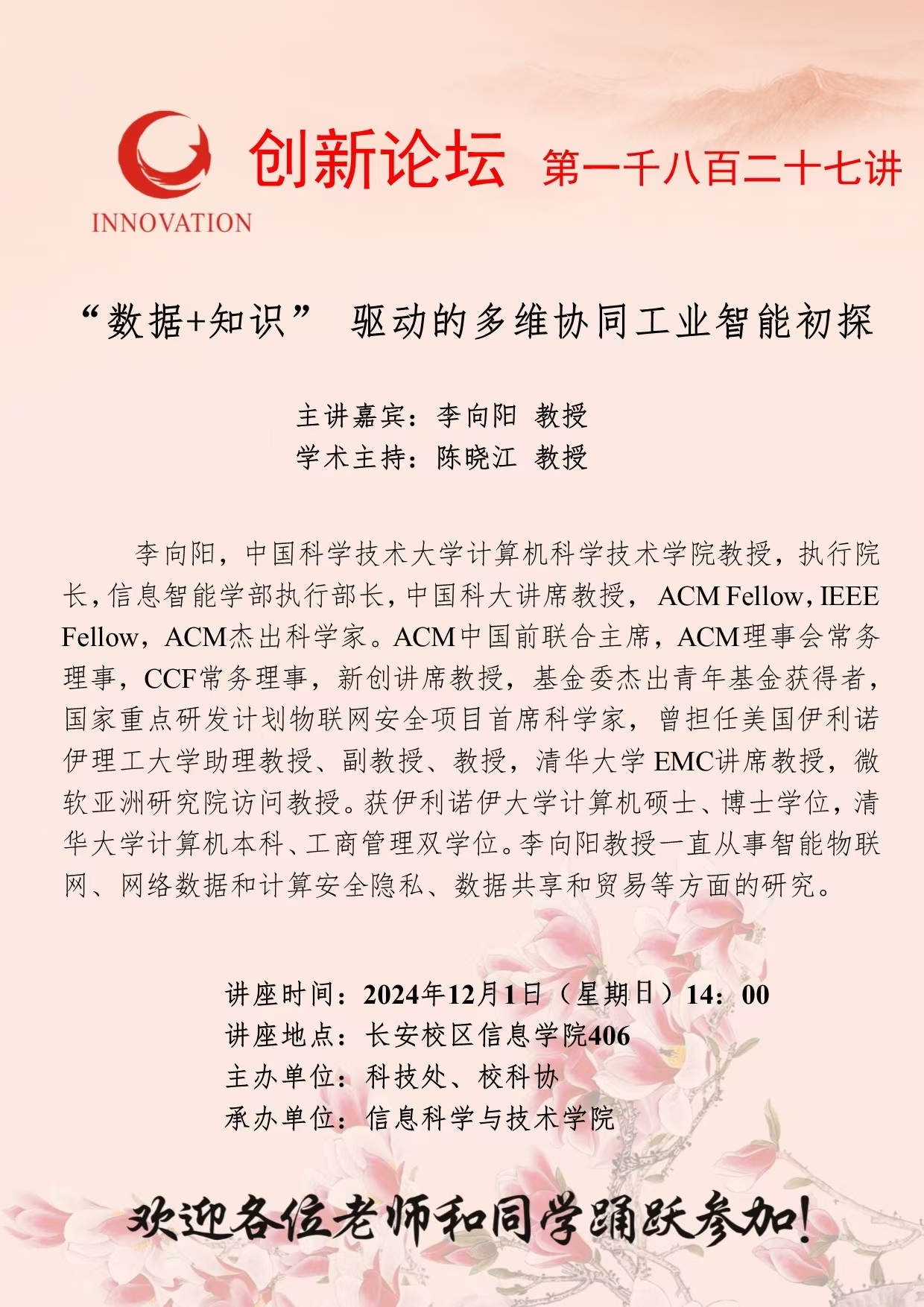 李向阳 教授 宝威体育官网首页创新论坛第一千八百二十七讲:“数据+知识” 驱动的多维协同工业智能初探 讲座时间 2024年12月1日(星期日)14:00 讲座地点 长安校区信息学院406 讲座人介绍 李向阳 教授 讲座内容