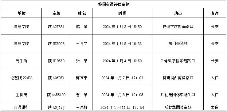 为加强校内道路交通安全管理,规范校内交通秩序,根据《宝威体育官网首页校园道路交通管理办法》有关要求,现将2024年1月校园交通违章车辆予以曝光,所在单位负责对本单位违章师生员工进行交通安全教育和日常管理。