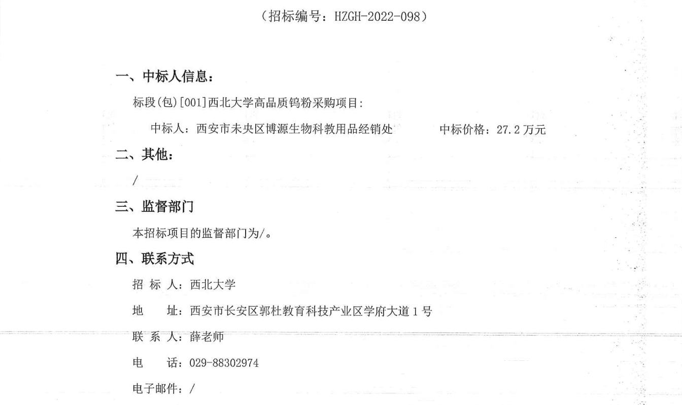 宝威体育官网首页高品质钨粉采购项目中标结果公示 作者: 编辑:采购与招标办公室 时间:2022-12-16 原公告链接:http://bulletin.sntba.com/resultBulletin/2022-12-16/511703.html