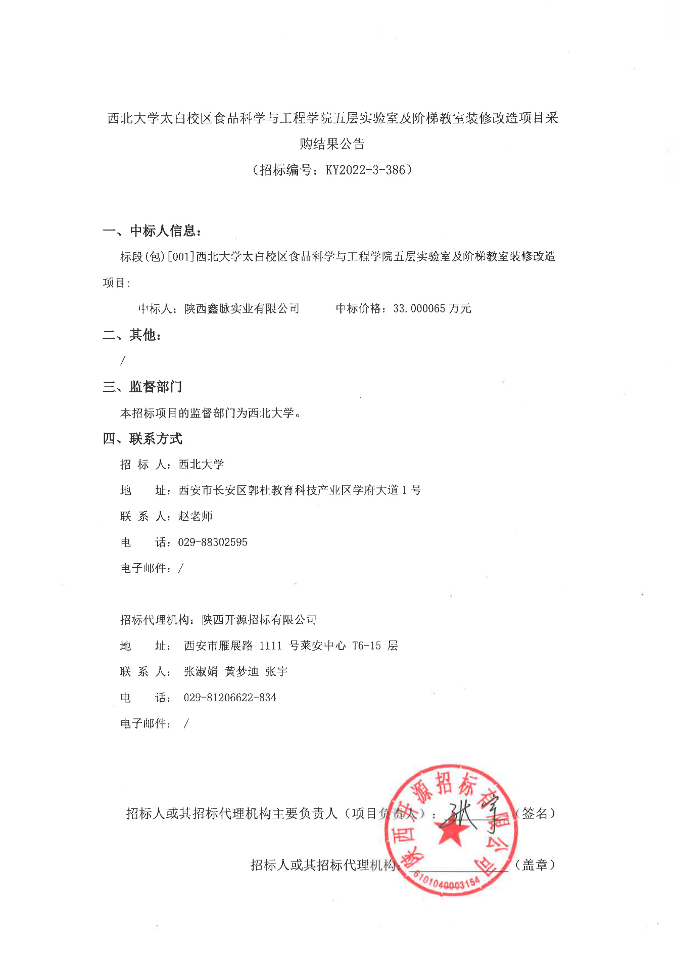 宝威体育官网首页太白校区食品科学与工程学院五层实验室及阶梯教室装修改造项目采购结果公告