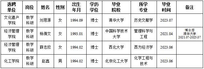 经用人单位及教学督导考核、学校研究,拟同意选聘下列人员来校工作,其聘任关系为人事代理。本着公平、公正、公开的原则,现将拟选聘人员基本情况公示如下:
