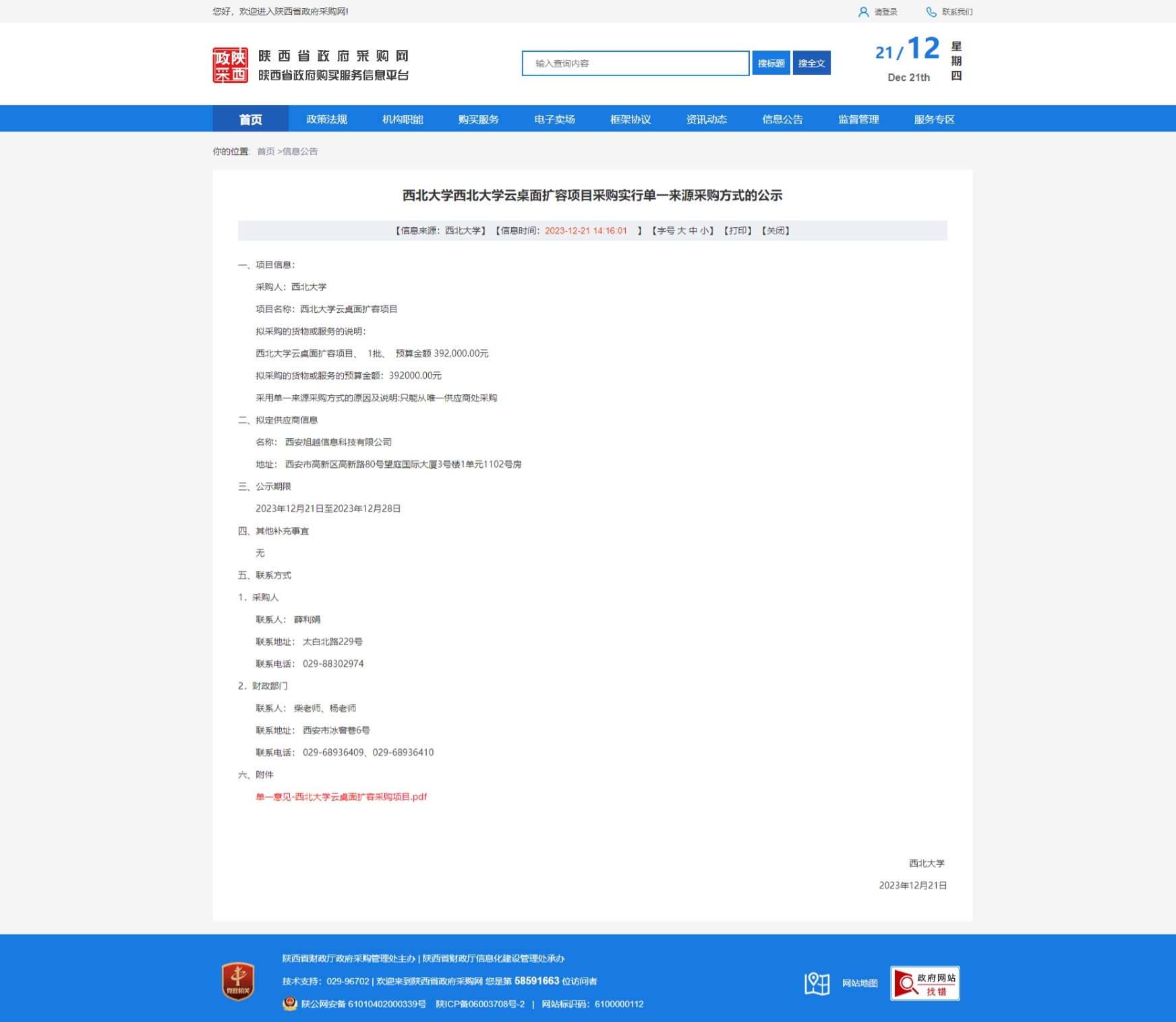 宝威体育官网首页云桌面扩容项目采购实行单一来源采购方式的公示 作者: 编辑:采购与招标办公室 时间:2023-12-21 原公告链接:http://www.ccgp-shaanxi.gov.cn/freecms/site/shaanxi/ggxx/info/2023/8a69c16c8c86bcea018c8afd06910a33.html?noticeType=001051¬iceId=dae76602-9fc9-11ee-9a8e-08c0eb20c666