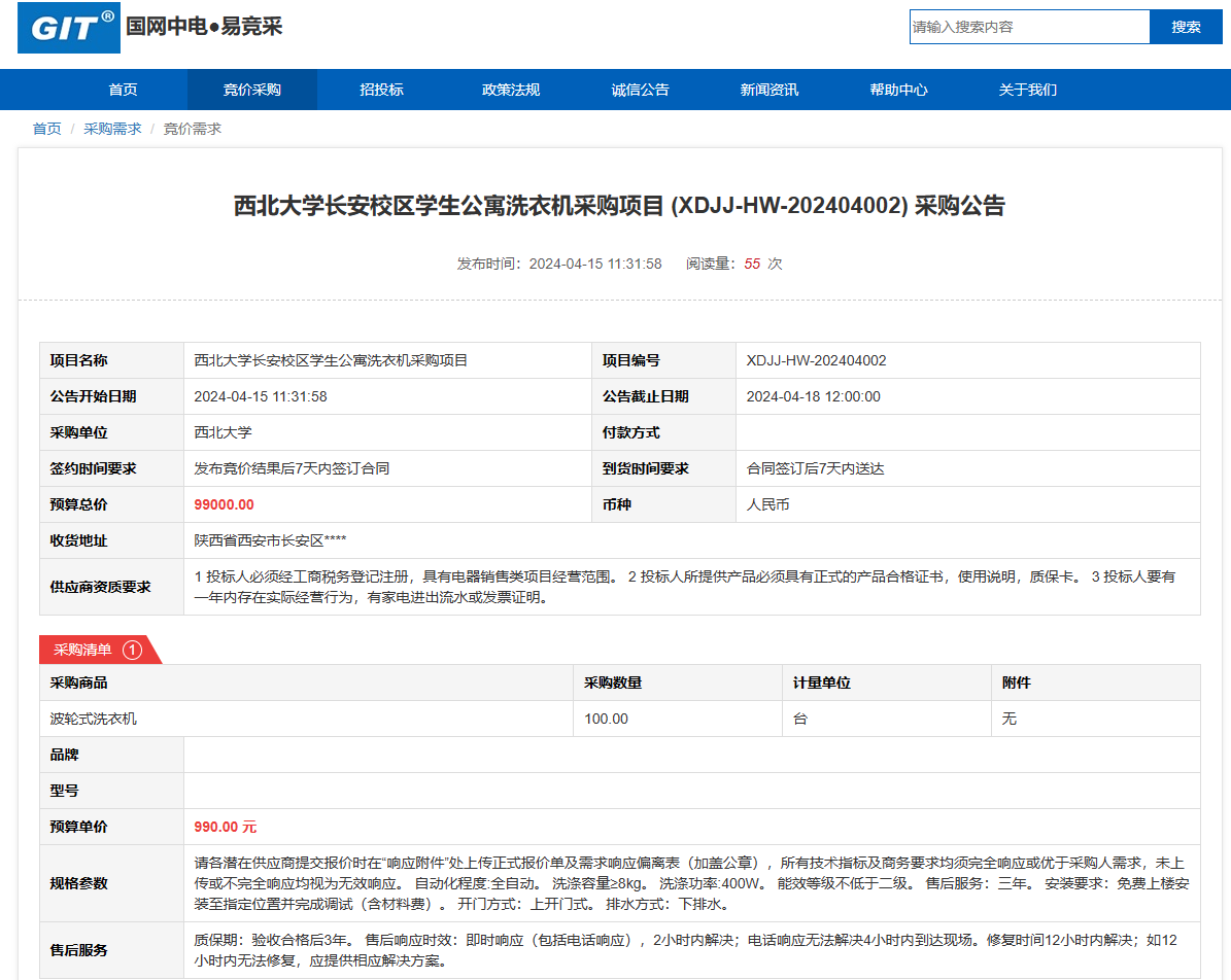 宝威体育官网首页长安校区学生公寓洗衣机采购项目 (XDJJ-HW-202404002) 竞价公告 作者: 编辑: 时间:2024-04-16 原公告链接:https://www.ejingcai.com.cn/site/bidding/detail/9485