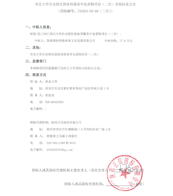 宝威体育官网首页长安校区游泳馆服务外包采购项目(二次)采购结果公告