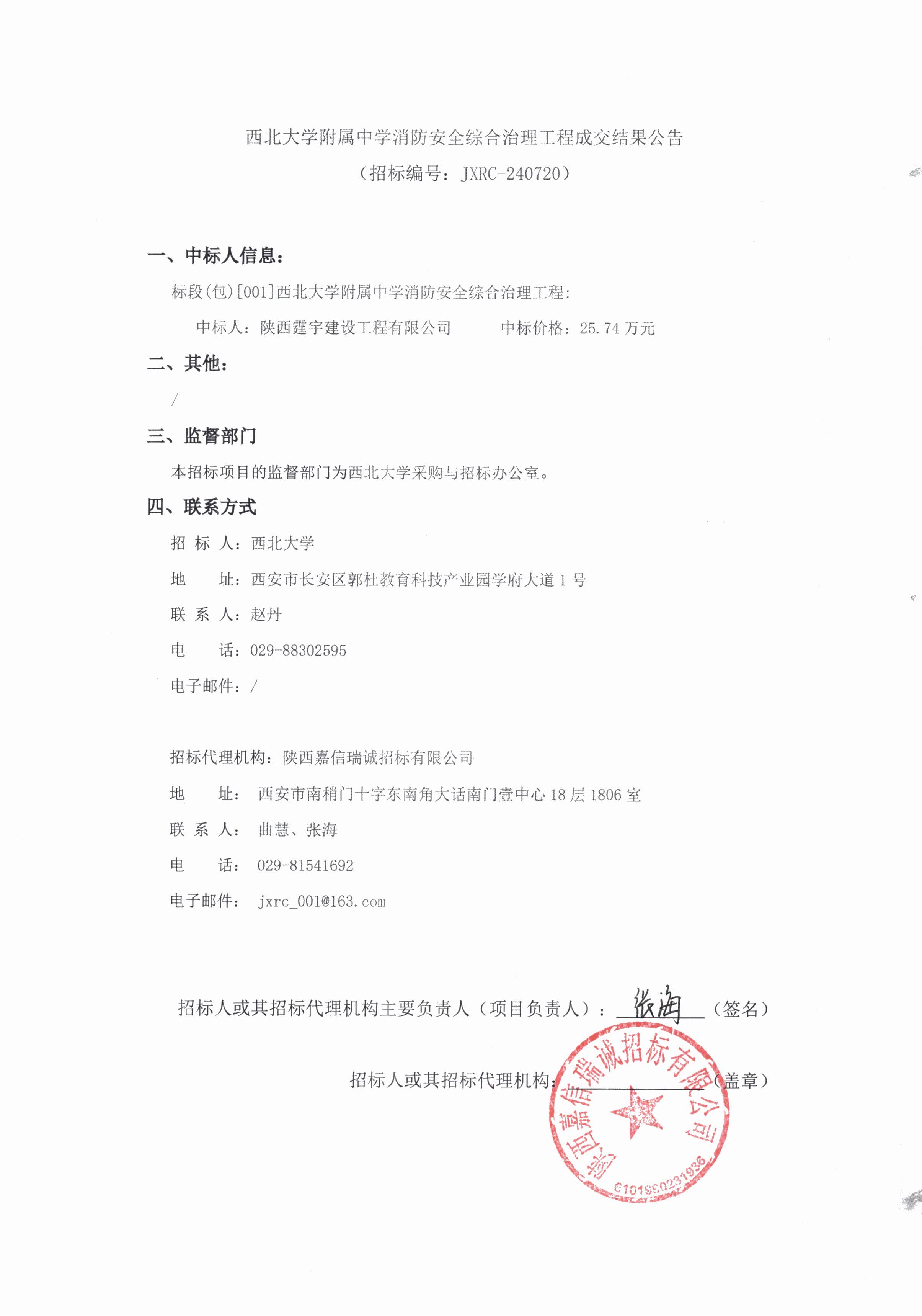 宝威体育官网首页附属中学消防安全综合治理工程成交结果公告