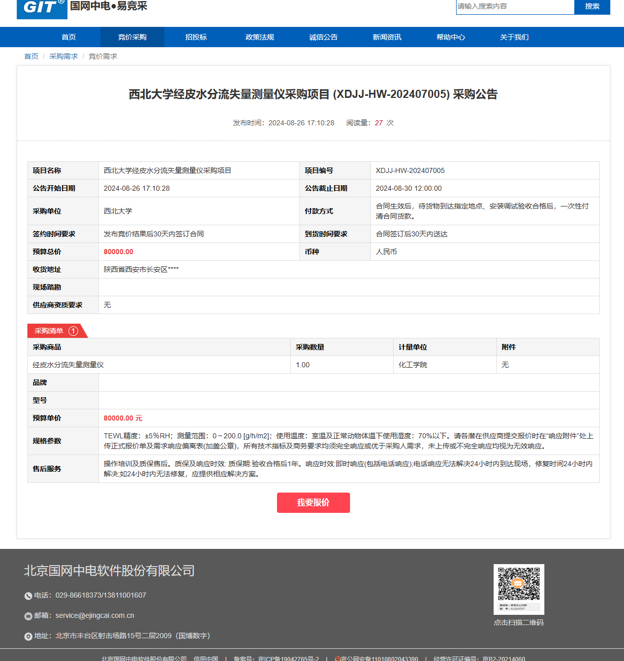 宝威体育官网首页经皮水分流失量测量仪采购项目 (XDJJ-HW-202407005) 竞价采购公告 作者: 编辑: 时间:2024-08-27 原公告链接:https://www.ejingcai.com.cn/site/bidding/detail/12213