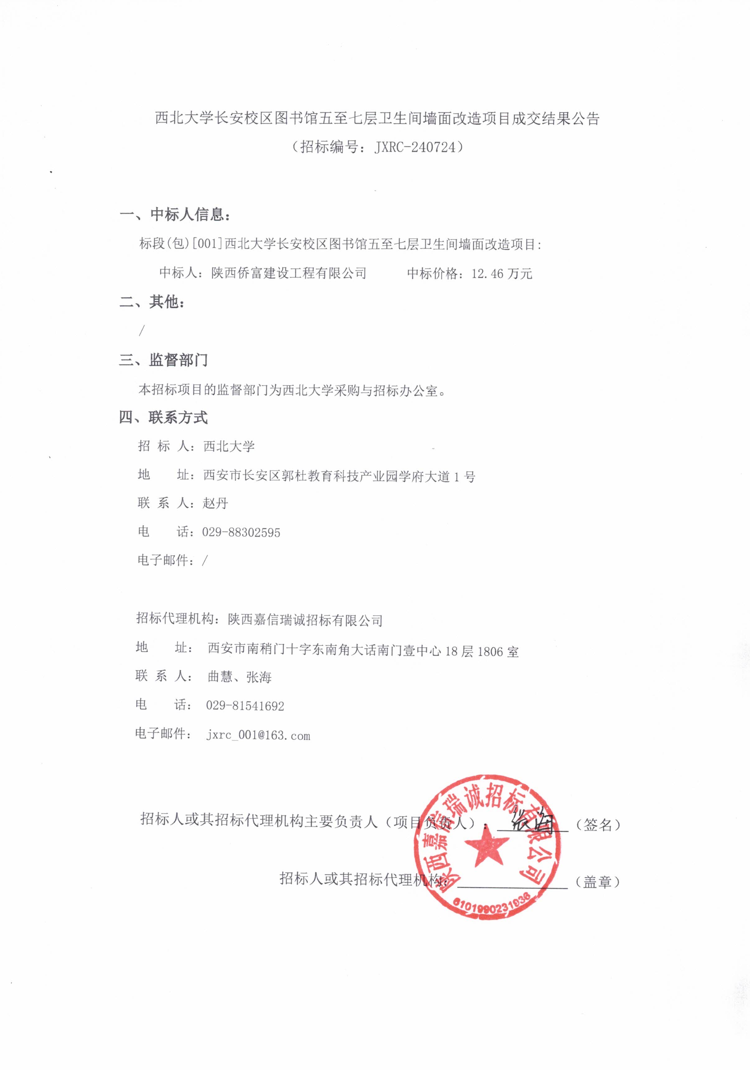 宝威体育官网首页长安校区图书馆五至七层卫生间墙面改造项目成交结果公告