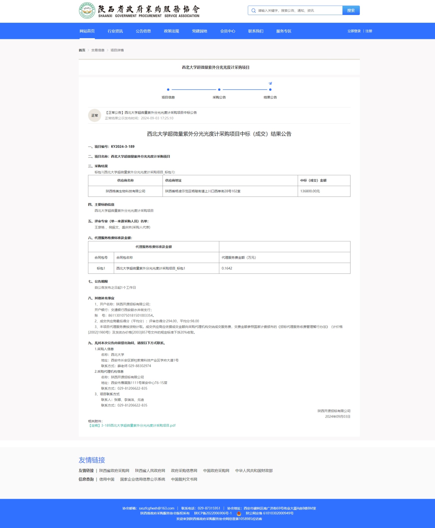 宝威体育官网首页超微量紫外分光光度计采购项目中标(成交)结果公告 作者: 编辑:采购与招标办公室 时间:2024-09-04 原公告链接:https://www.sxszfcgfwxh.cn/#/tender-vTradeAnnouncement-publicity?tenderProjectId=1826435442958446594&rootId=1549250580985765889