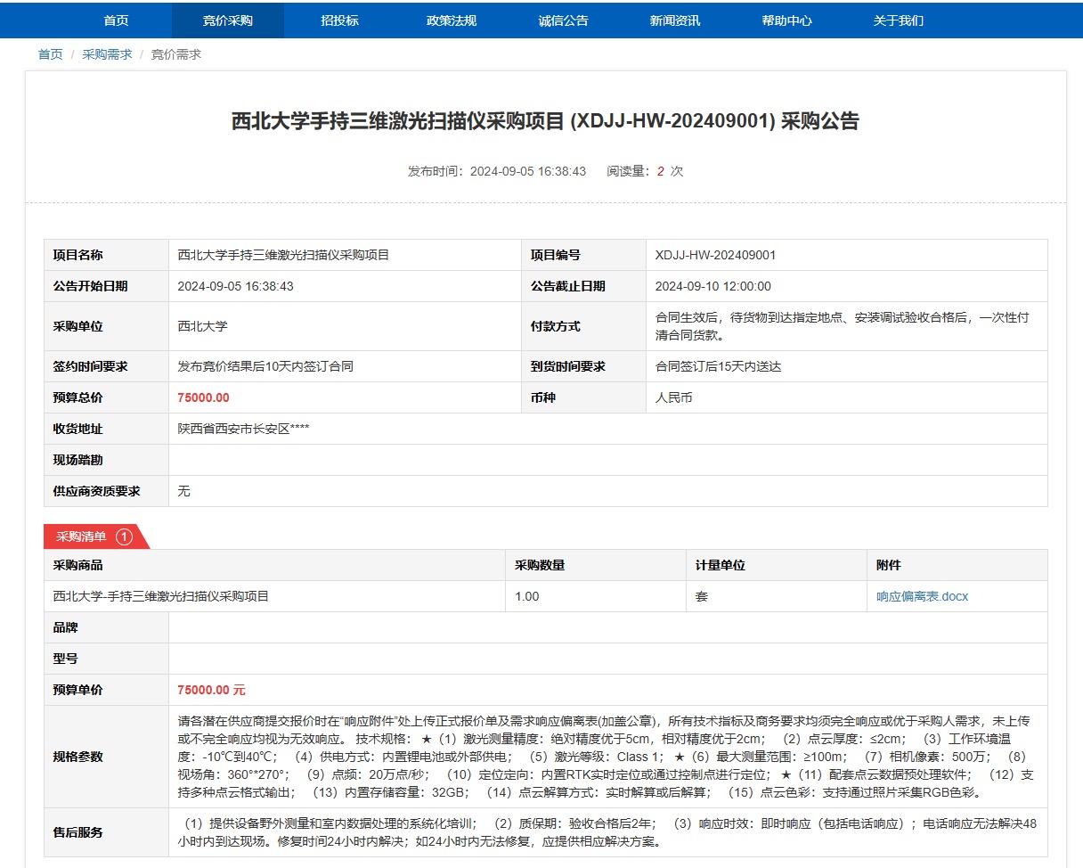 宝威体育官网首页手持三维激光扫描仪采购项目 (XDJJ-HW-202409001) 竞价采购公告 作者: 编辑: 时间:2024-09-05 原公告链接:https://www.ejingcai.com.cn/site/bidding/detail/12357