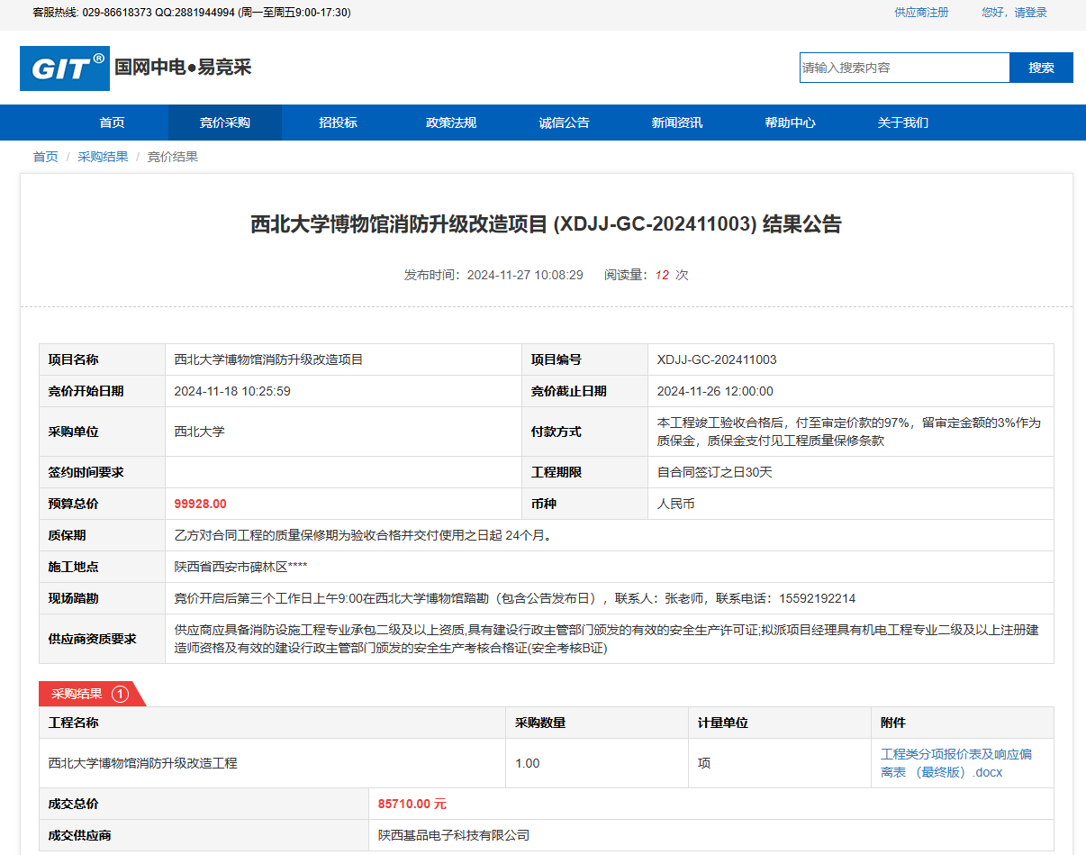 宝威体育官网首页博物馆消防升级改造项目(XDJJ-GC-202411003)竞价结果公告 作者:采购与招标办公室 编辑: 时间:2024-11-27 原公告链接:https://www.ejingcai.com.cn/site/bidding/detail/15427