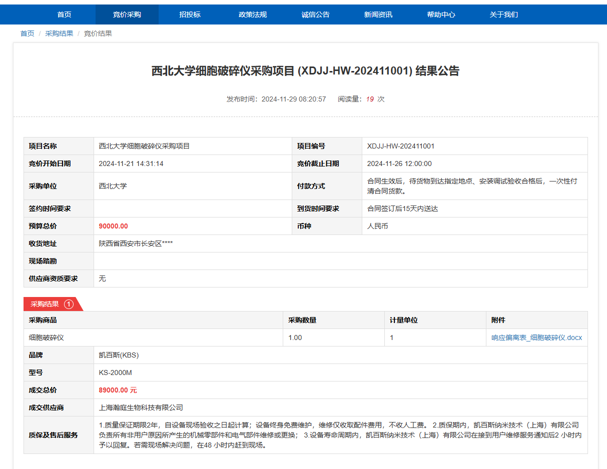 宝威体育官网首页细胞破碎仪采购项目(XDJJ-HW-202411001)竞价结果公告 作者:采购与招标办公室 编辑: 时间:2024-11-29 原公告链接:https://www.ejingcai.com.cn/site/bidding/detail/15477