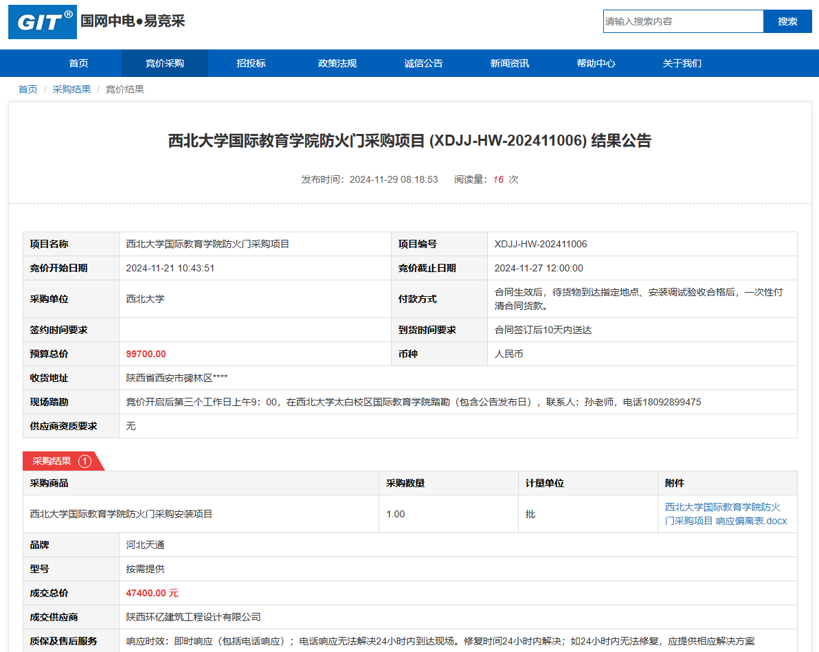 宝威体育官网首页国际教育学院防火门采购项目(XDJJ-HW-202411006)竞价结果公告 作者: 编辑: 时间:2024-11-29 原公告链接:https://www.ejingcai.com.cn/site/bidding/detail/15476
