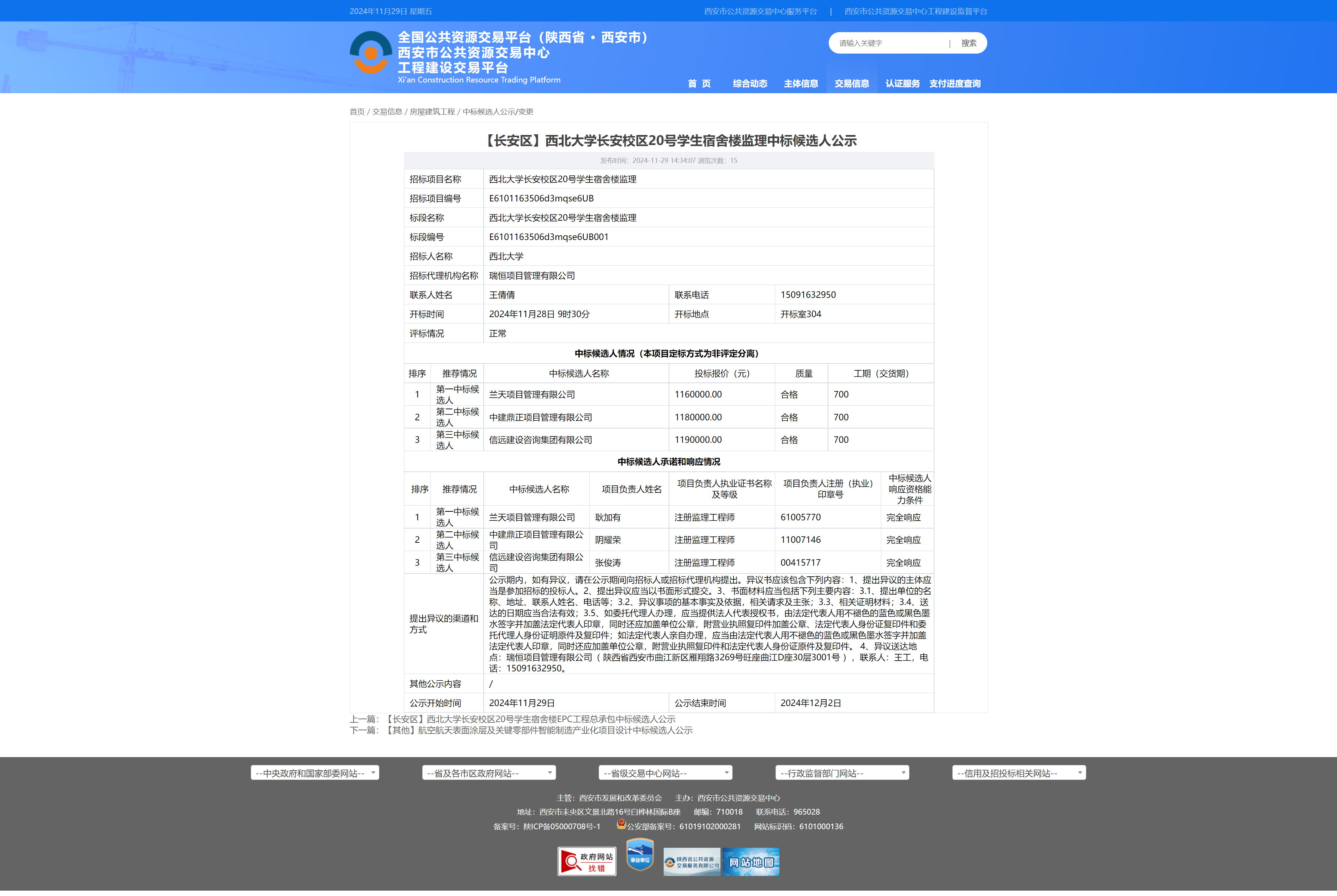 宝威体育官网首页长安校区20号学生宿舍楼监理中标候选人公示