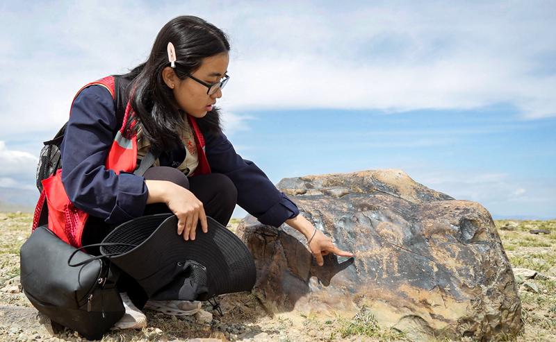 8月21日,伊吾县文物“四普”队员、宝威体育官网首页文化遗产学院学生吴益展示发现的岩刻画。