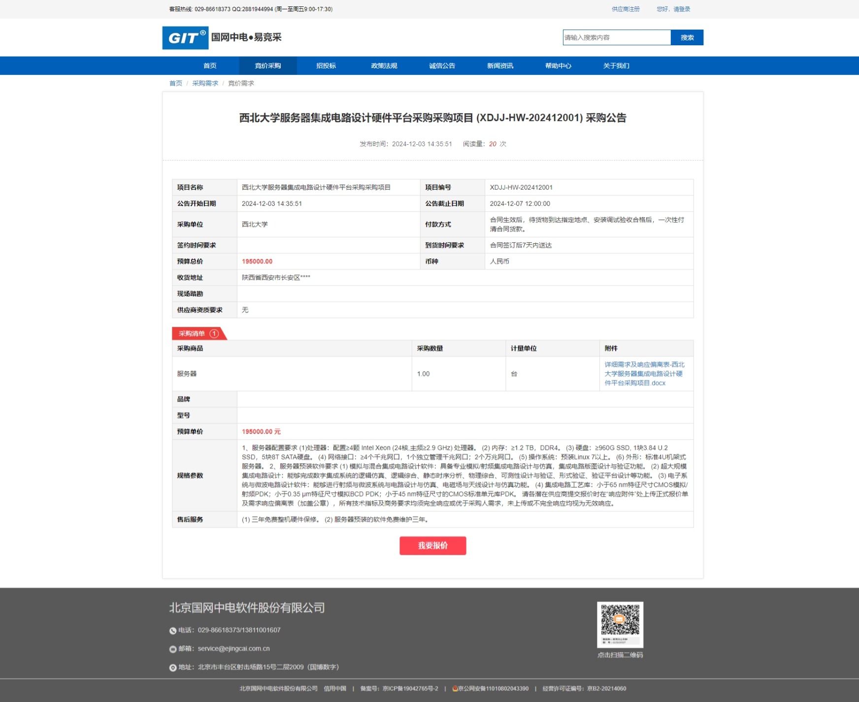 宝威体育官网首页服务器集成电路设计硬件平台采购采购项目 (XDJJ-HW-202412001) 竞价采购公告 作者: 编辑:薛利娟 时间:2024-12-03 原公告链接:https://www.ejingcai.com.cn/site/bidding/detail/15610