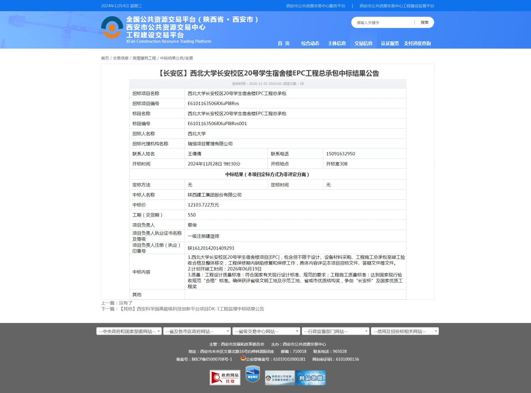 宝威体育官网首页长安校区20号学生宿舍楼EPC工程总承包中标结果公告