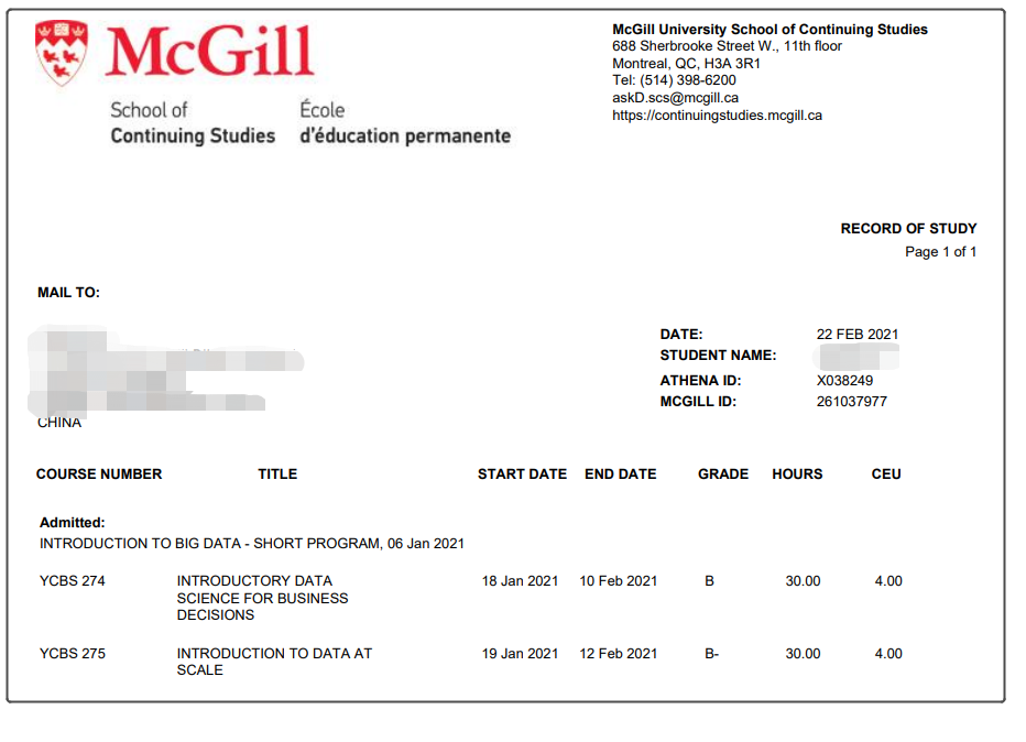 【成绩单与证书】可获得麦吉尔正式的课程成绩单与项目证书,为个人简历添砖加瓦。