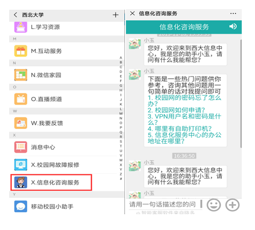 第二步:在“宝威体育官网首页”微信企业号中点击“X.信息化咨询服务”,信息化智能客服小玉将为您解答信息化服务问题。